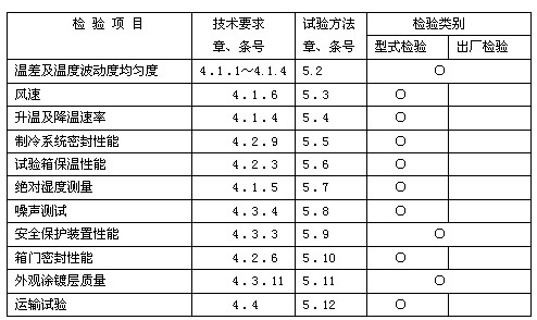 注:高低溫測試儀要求檢驗(yàn)的項(xiàng)目用“○”表示,無“○”者表示不要求檢驗(yàn)。