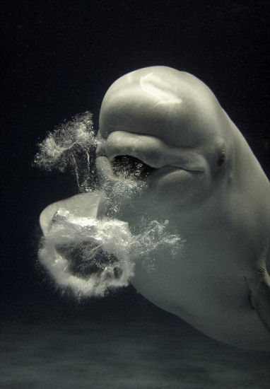 生活在日本島根縣水族館的白鯨共有3頭,圖中白鯨是其中之一。憑借在水中吐泡泡這種引人注目的表演,3頭白鯨成為游人推崇的對象。島根縣水族館共生活著1萬只動物,白鯨是其中最吸引游人目光的動物之一。這位日本攝影師Hiroya Minakuchi是在島根縣水族館拍到這頭白鯨吐泡泡畫面的。自從白鯨無師自通地學會了吹出一個像天使光圈狀的泡泡之后,她就成了島根水族館里的“紅人”。這頭可愛的小白鯨約10歲,三年多前學會了吹氣泡這門技巧,從此,憑借這獨門絕技迷倒了一大批來此參觀的游客。 拍攝這張照片的攝影師現(xiàn)年58歲,來自大阪。他并非水族館的工作人員,但卻是唯一一位被允許進入水族館內(nèi)與小白鯨潛水拍攝的人。他說,這頭白鯨是在她7歲的時候開始吐泡泡的,并且她在兩年之后“升級”了她的絕技,F(xiàn)在她會把水從嘴里吐出來形成一股水流,人們其實看不出水下的這股水流;然后她會再從她頭頂?shù)臍饪桌飮姵鲆还蓺饬,這股氣流沖進此前噴出的水中,從而形成一個圓環(huán)形氣泡。“我覺得這對她來說,是一種享受和娛樂。自從她開發(fā)了這門新游戲之后,她就經(jīng)常將這門新手藝向游客展示”攝影師說,“因為我是水族館外唯一可跟這頭白鯨一起潛水的人,因此我得以抓拍到她那美妙的一瞬! |