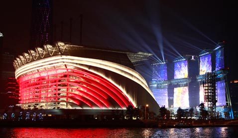 幕式場(chǎng)地夜間照明效果試燈。2010年11月12日,第十六屆廣州亞運(yùn)會(huì)開(kāi)幕式將在此舉行。